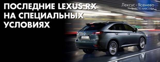 * Количество автомобилей, на которые распространяется предложение, ограниченно. Специальные рекомендованные розничные цены на модель Lexus RX 2015 года выпуска. Специальная рекомендованная розничная цена 2 112 000 рублей действительна на модель Lexus RX 270 в комплектации Prestige (Престиж). Срок действия акции с 1 по 31 декабря 2015 года. Сведения о ценах носят исключительно информационный характер. Указанные цены являются рекомендованными розничными ценами и могут отличаться от действительных цен. Информацию о действующих ценах на автомобили Lexus, количестве автомобилей, а также иные подробности необходимо уточнять у менеджеров отдела продаж Лексус - Ясенево по телефону: +7(495)777-77-12.